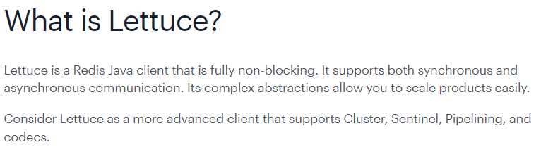 위는 Redis 공식 사이트에서 Lettuce와 Jedis를 설명한 글 중 Lettuce의 일부를 캡쳐한 내용이다.
