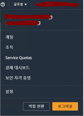 액세스 키 생성을 위해 AWS 로그인 후 우측 상단의 본인 계정을 클릭 한 후 보안 자격 증명을 클릭한다.