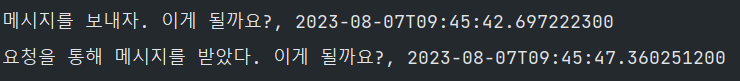 System.out.printf("요청을 통해 메시지를 받았다. %s, %s%n", message, LocalDateTime.now());