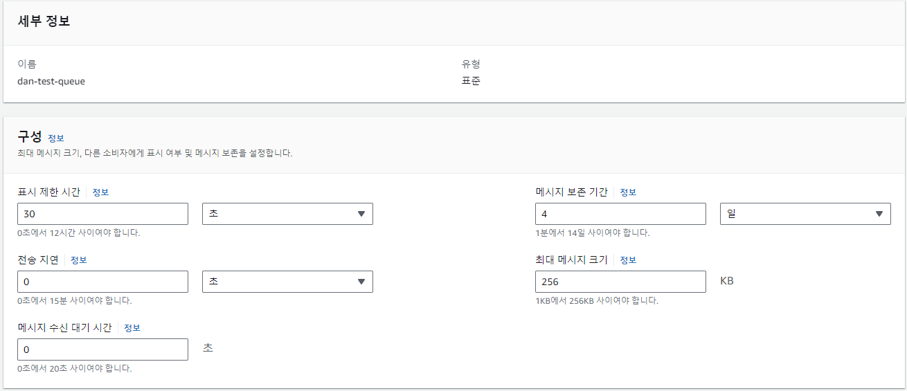 메시지 수신 대기 시간 : 폴링이 메시지를 수신할 수 있을 때까지 대기하는 최대 시간