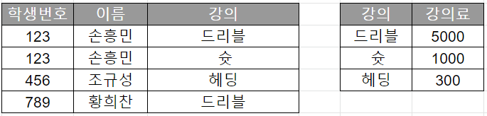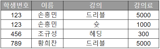 우선 위 테이블에서 드리블의 강의료를 변경하고 싶다. 그러면, 두 번의 수정이 필요하다. 위 테이블에서야 두 개지만 데이터가 수천 수만가지가 된다면, 수천 수만번 업데이트를 해줘야 한다는 뜻이다.