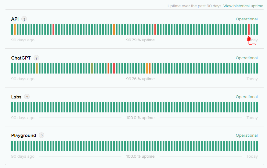 나중에 찾아보니 openAI 서버의 status를 공유해 주는 사이트가 있었다. https://status.openai.com/#