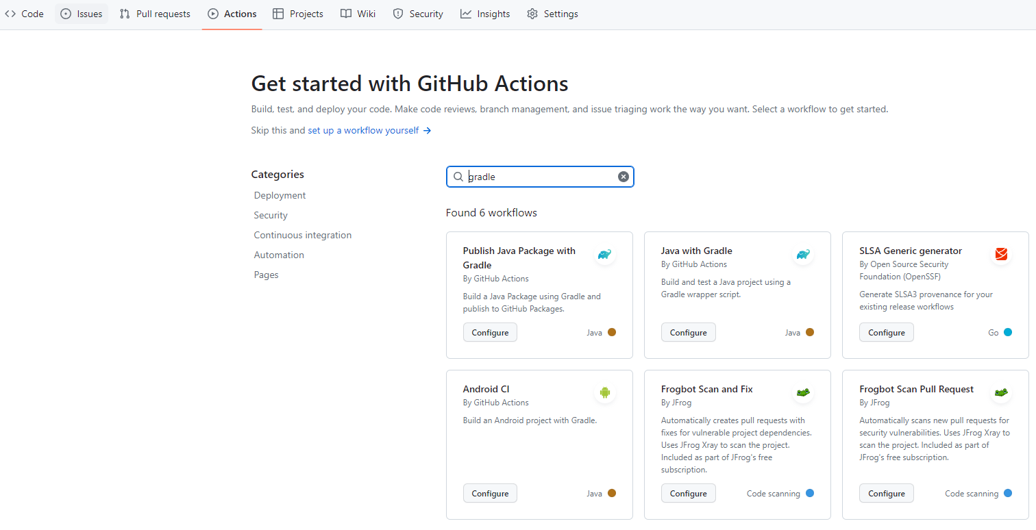 action 탭에 가서 java with gradle 찾기