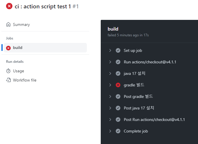 actions/checkout은 소스코드를 받아온 후 자바 버전을 설치하고 gradle 빌드를 하는 것 같다.