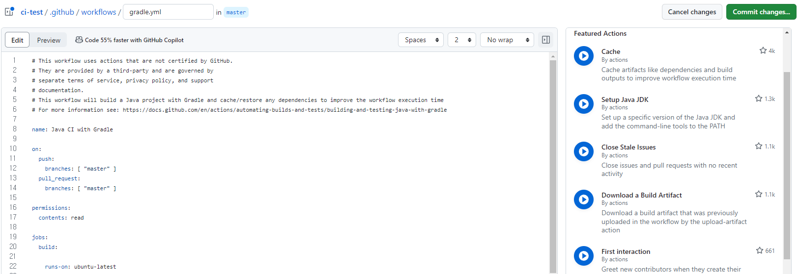 GitHub Action Java Gradle Cache 를 구글링하면 Gradle 캐시를 할 수 있는 워크플로가 나온다.