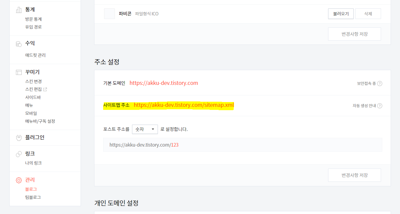 티스토리에서 제공하는 sitemap 페이지는 블로그 관리 > 관리 > 블로그 > 주소 설정 > 사이트맵 주소 경로에서 확인 가능하다.