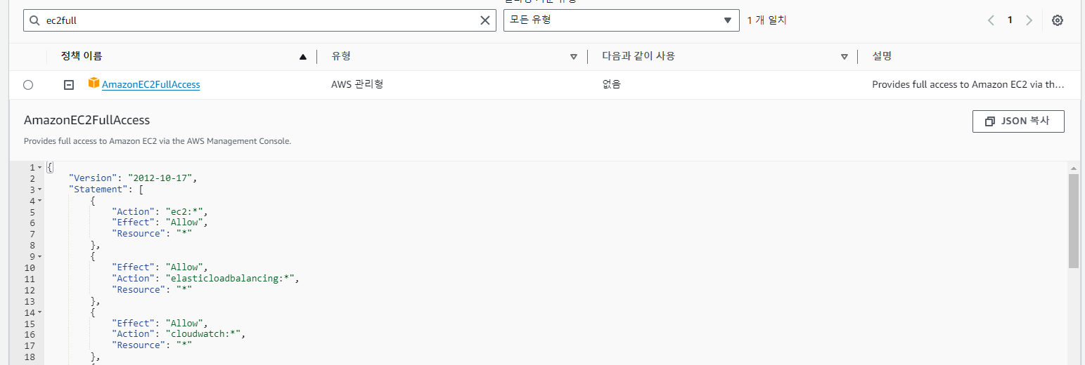 정책 하나를 열어보면, json으로 정리되있는 권한들을 확인할 수 있다.