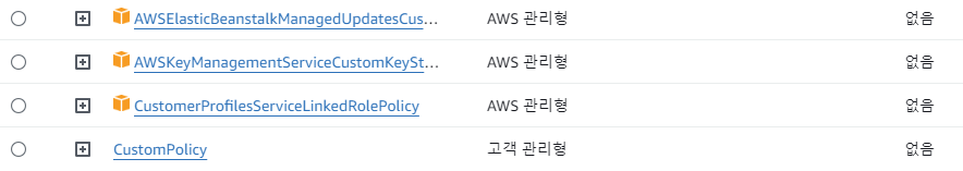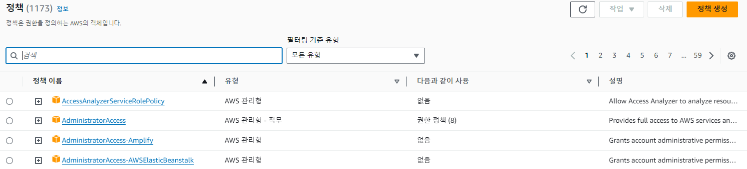 정책 탭에 들어가보면, AWS에서 제공하고 있는 기본 정책들을 확인할 수 있다.