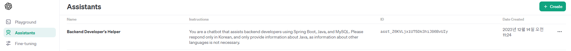 openAI에 playground에서 Assistants가 잘 생성되었나 확인할 수 있는 부분들이 있다.