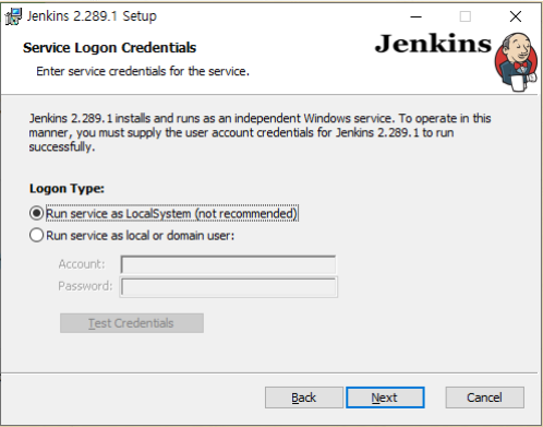 여기였다. 저 상태로 젠킨스를 실행시키면 LocalSystem 계정으로 Jenkins가 실행된다.