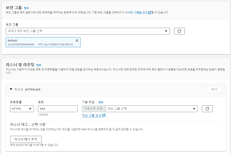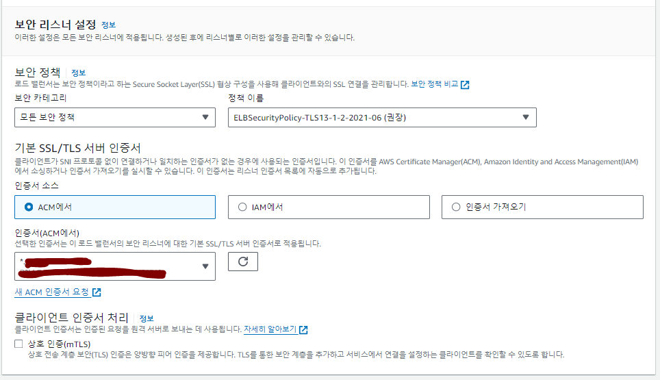 HTTPS로 지정하면, 보안 리스너 설정이란게 나와서 미리 발급받아둔 ACM을 지정하자.