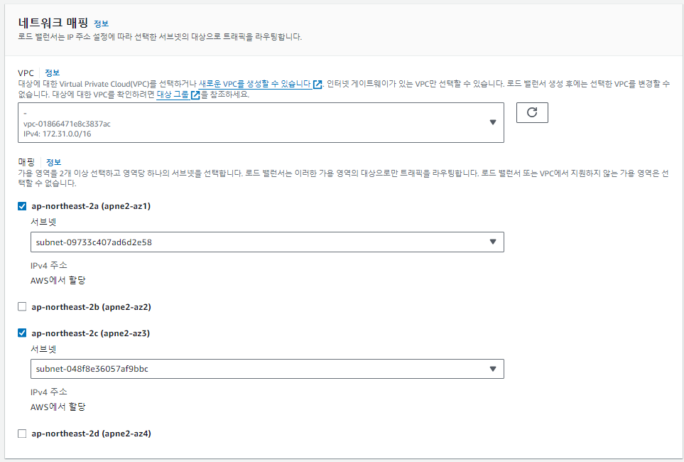 ALB 설정에 주의할 점은, ALB에서 VPC 서브넷은 두 개 이상 지정해야만 한다는 것과