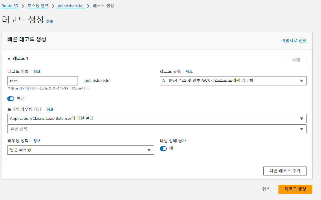 서브도메인을 만들고 별칭으로 로드밸런서의 ARN을 넣으면 끝난다.