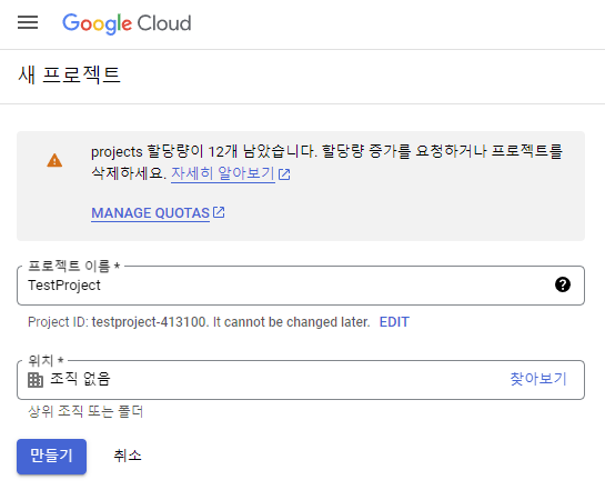 우측 상단 프로젝트 선택 > 새 프로젝트 클릭