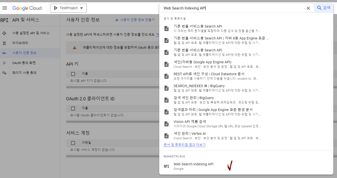 여기서부터 설명이 점프해버리는데, 키를 발급받기 위해 내가 사용할 API인 Web Search Indexing API 검색한다.