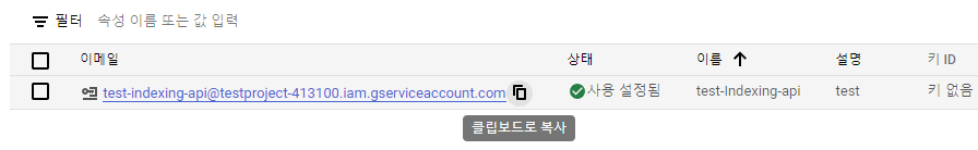 이제 이 계정을 복사하고, 서치 콘솔의 사용자로 등록해야 한다.