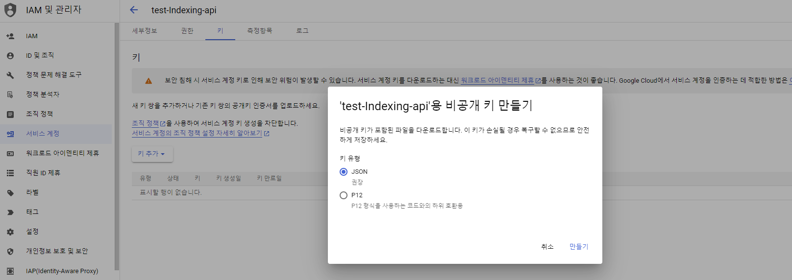Web Indexing API 사용 가능한 서비스 계정 만들기