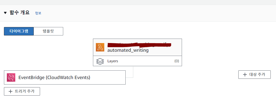 한시간마다 cloudwatch에서 event 트리거로 자동으로 동작시켜준다. 올바르게 설정되면 lambda 콘솔에 트리거가 나타난다.