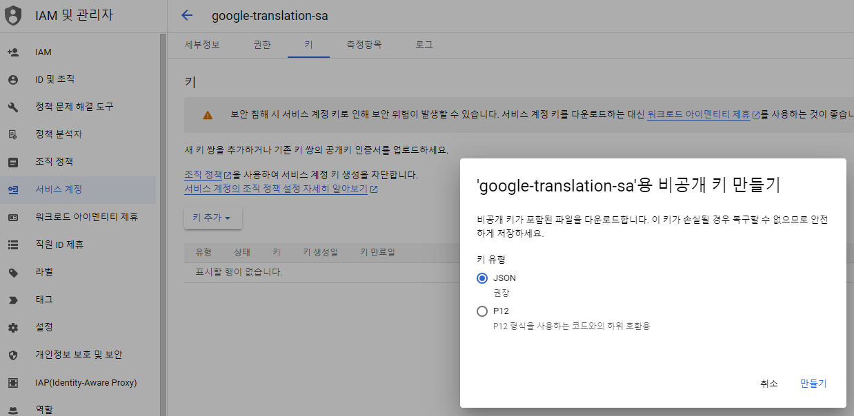 IAM 및 관리자 > 서비스 계정 > [지정한 아이디]@[프로젝트명].iam.gserviceaccount.com 클릭 > 키 > 키 추가 > JSON