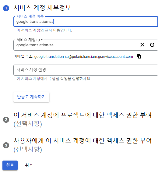 두번째 이미지에서 Cloud Translation API에 대한 역할을 모두 부여했다.