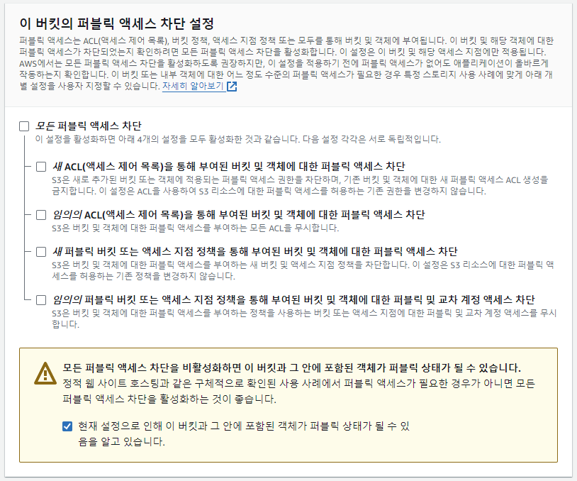 AWS S3 > 버킷 > 버킷 만들기 > 이 버킷의 퍼블릭 액세스 차단 설정