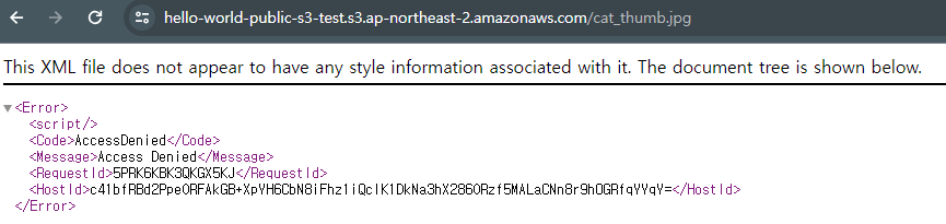 이 상태로 이미지를 하나 올려두고 접근해보면 AccessDenied 에러가 발생한다.