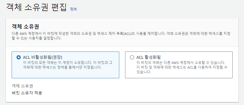 이 객체는 S3에서 자체적으로 업로드했기 때문에 버킷을 만들 때 아래에 설정한 객체 소유권(ACL) 옵션을 따라가게 된다.