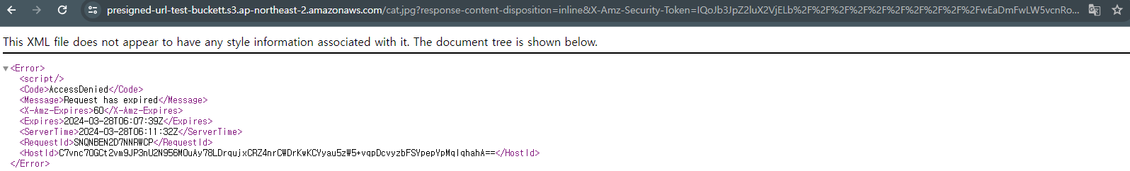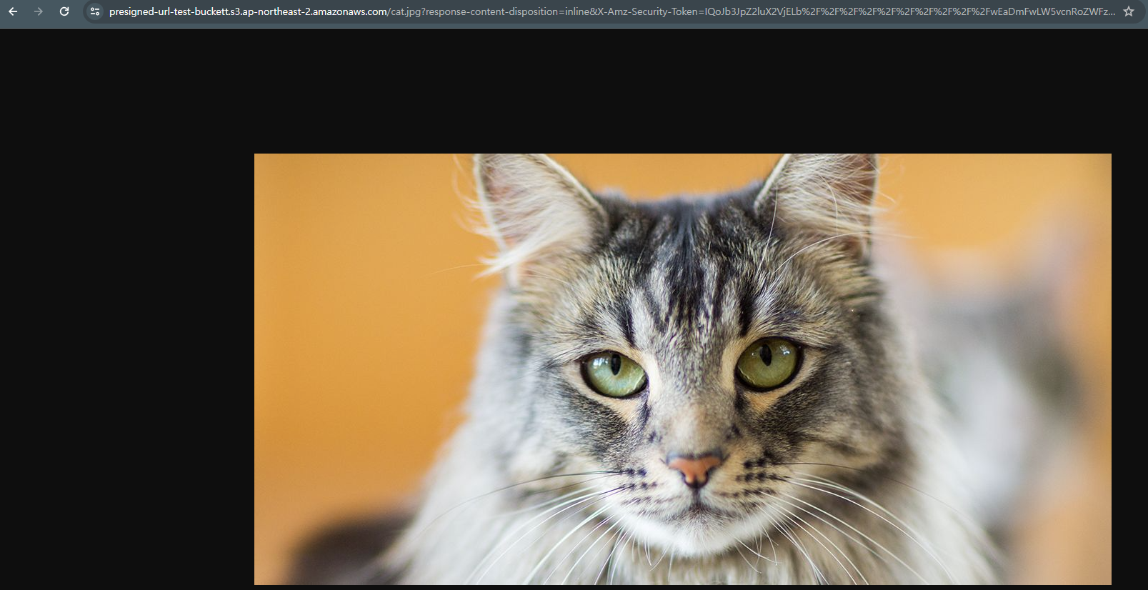 // Presigned URL: https://presigned-url-test-buckett.s3.ap-northeast-2.amazonaws.com/cat.jpg?X-Amz-Algorithm=AWS4-HMAC-SHA256&X-Amz-Date=20240328T062302Z&X-Amz-SignedHeaders=host&X-Amz-Expires=29&X-Amz-Credential=AKIAUVLNZG2X3MSEHUON%2F20240328%2Fap-northeast-2%2Fs3%2Faws4_request&X-Amz-Signature=4341de2f011660c346566663025c7c86042edcd64287c70bf65a4c756d334dd7