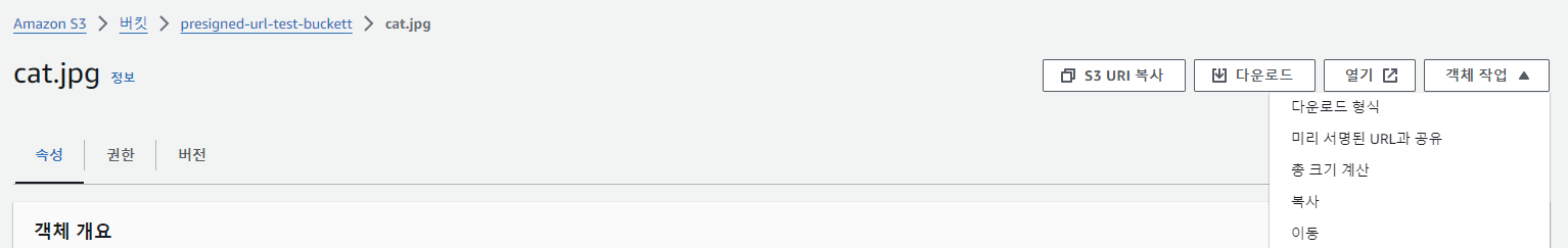 S3 > 버킷 > 버킷 선택 > 객체(이미지 파일) 선택 > 객체 작업 > 미리 서명된 URL과 공유