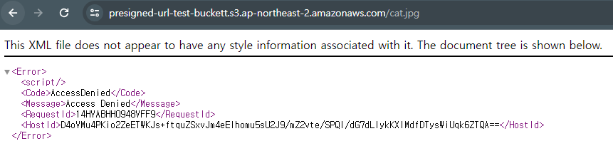 이미지를 S3(프라이빗으로 생성된 S3)에 업로드하고 url에 접근한다면 당연히 access denied가 노출된다.
