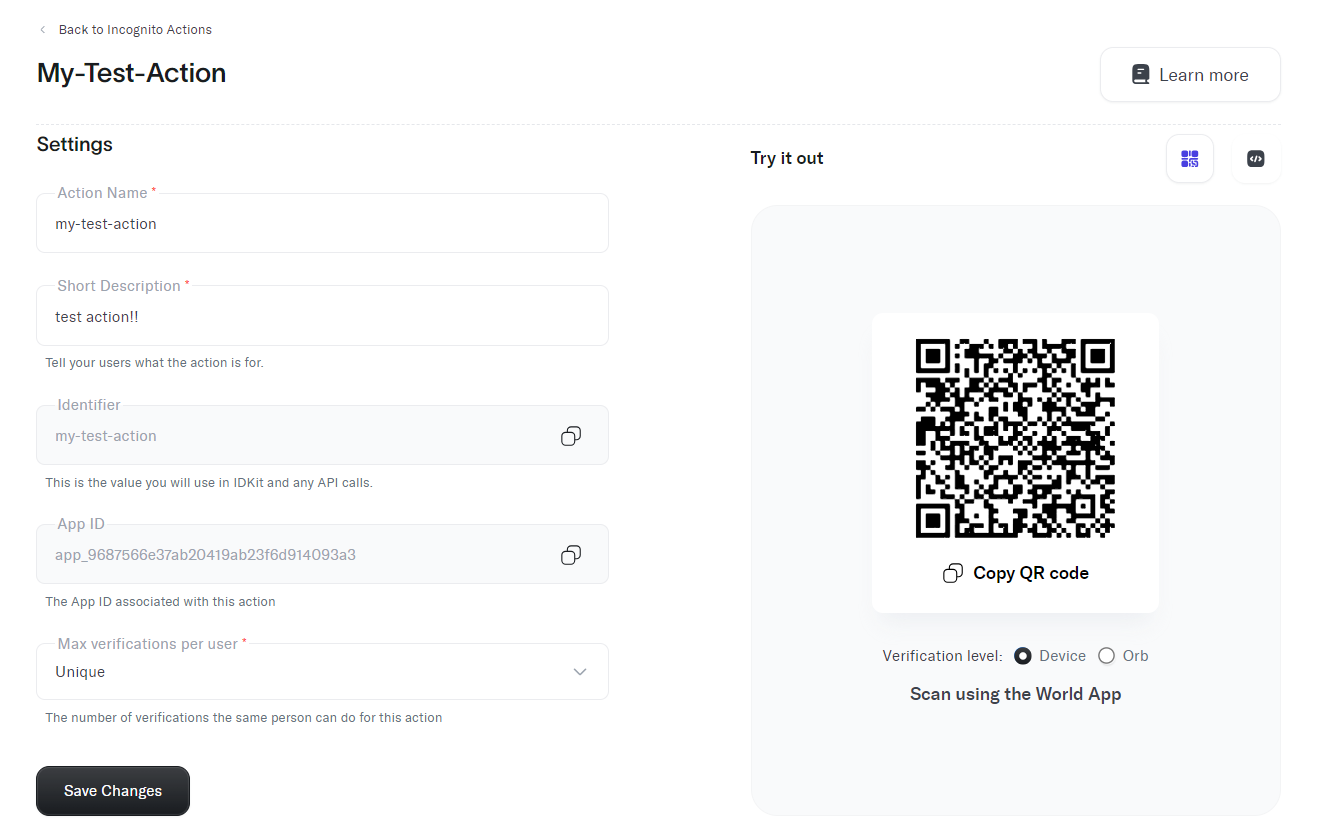 인증 과정을 위해서 우선 world developer potal에 앱을 만들고 incoginito action을 만들어야 한다.