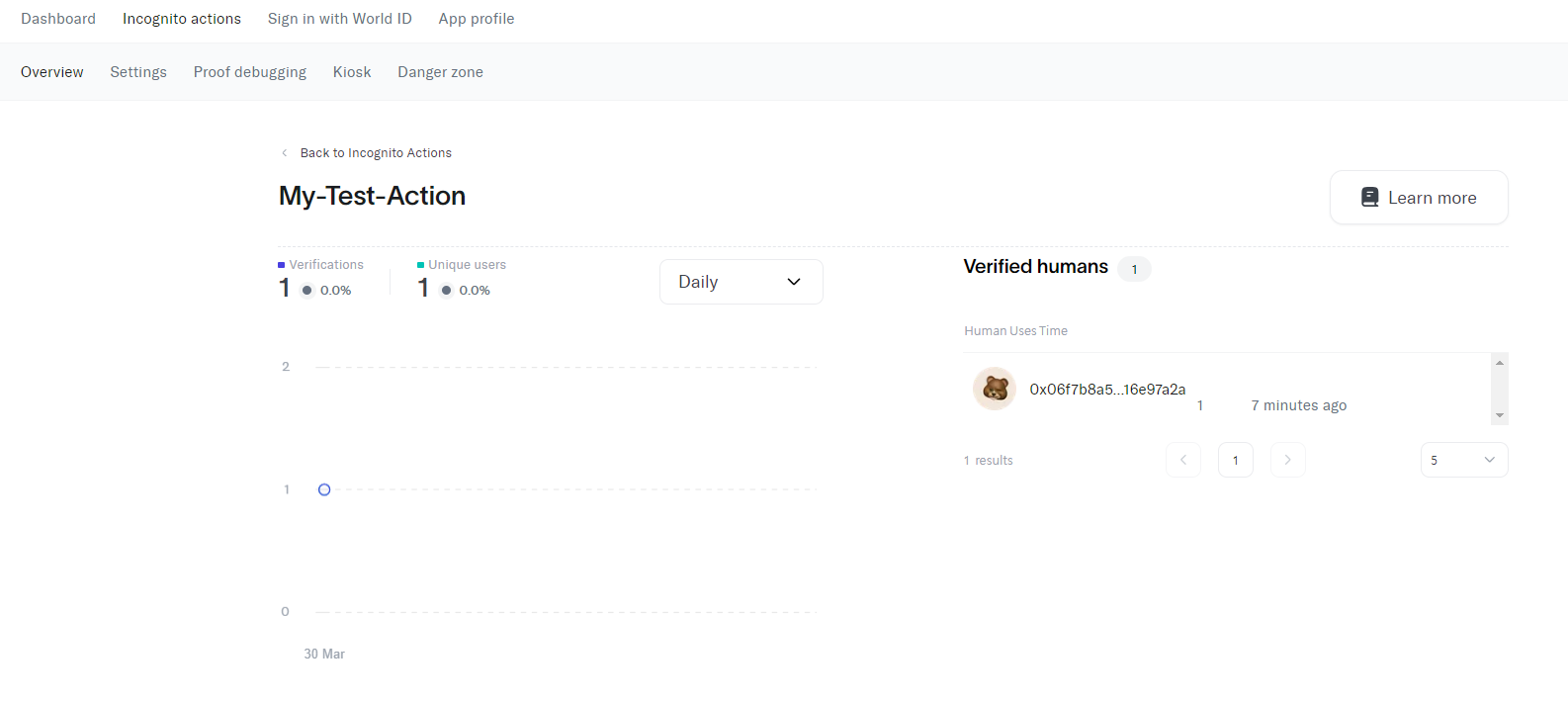 app 선택 > incognito action > action 선택 > overview 에서 확인 가능