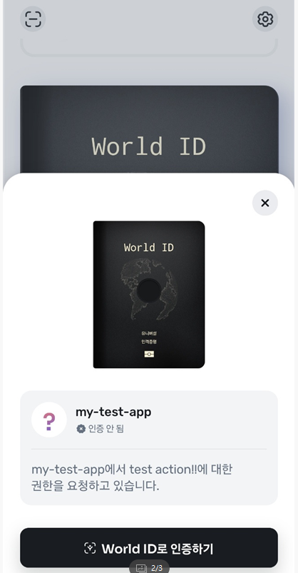- world app을 통해 QR을 체크하면 Connected, 인증을 완료하면 완료 메시지가 뜬다.