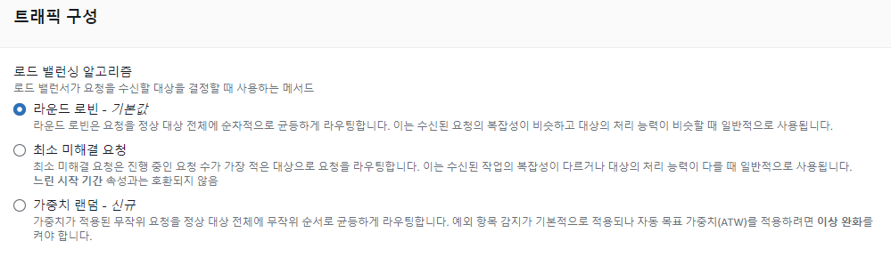 EC2 > 로드 밸런싱 > 타겟 그룹 > 그룹 이름을 선택 > 그룹 세부 정보 > 속성 > 편집 > 속성 편집 > 로드 밸런싱 알고리즘