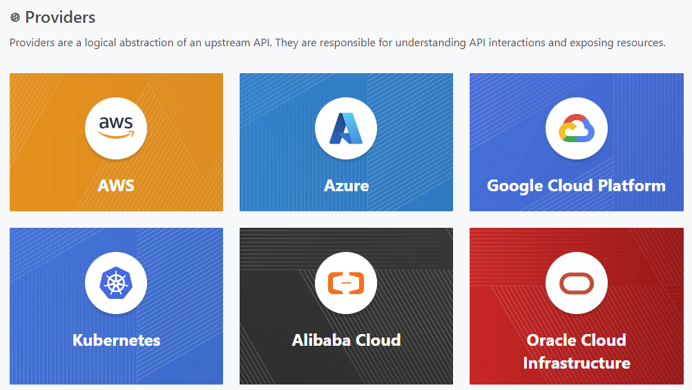 대부분의 Provider는 특정 인프라 플랫폼(클라우드 또는 자체 호스팅)을 구성한다. Provider는 고유한 리소스 이름에 대한 난수 생성과 같은 작업을 위해 로컬 유틸리티를 제공하기도 한다.