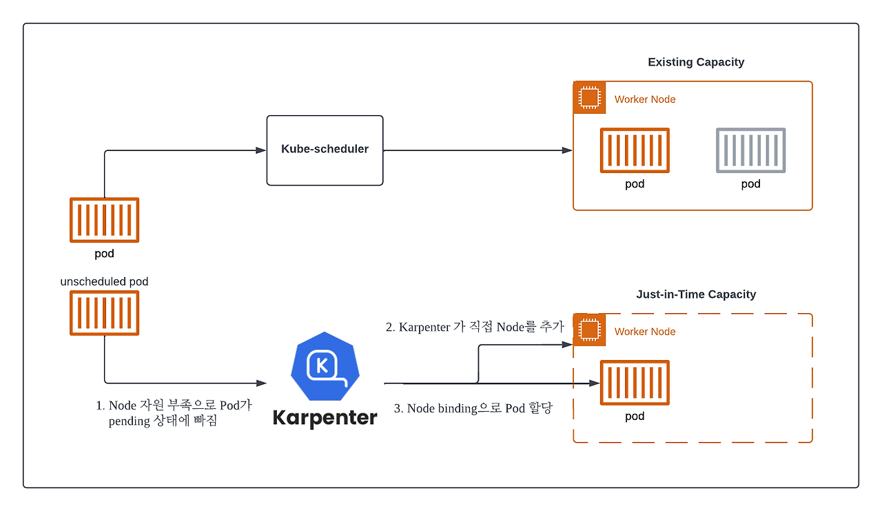 - 추가된 Node가 Ready 상태가 되면 Karpenter 는 kube-scheduler 를 대신하여 pod 의 Node binding 요청도 수행