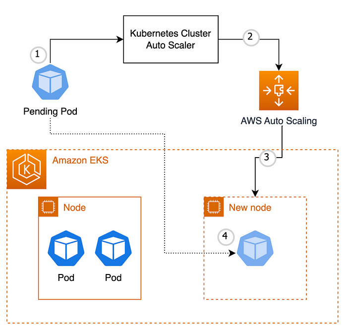 - 이를 인지한 ASG 가 새로운 Node를 추가여유 공간이 생기면 kube-scheduler 가 Pod를 새 Node에 할당.