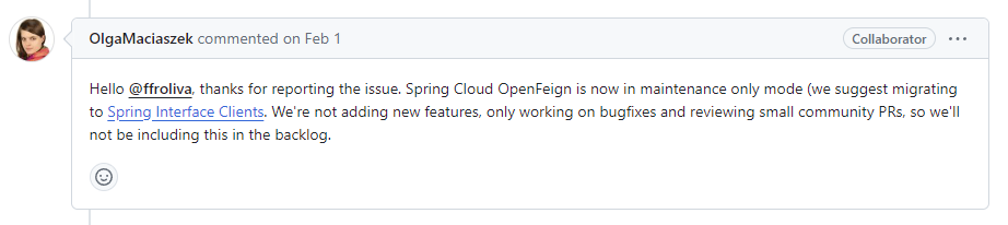 그런데 가장 관심이 있었던 OpenFeign은 메인터넌스 모드로 들어간다고 해서 리뷰가 빠르지 않을 것 같았고,
