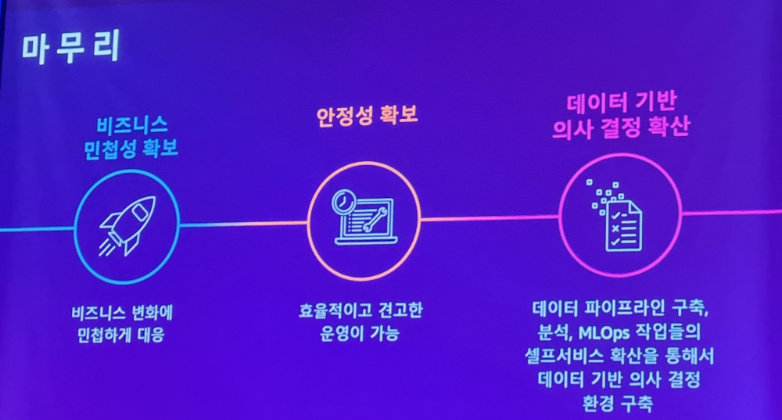 아파치 유니콘 적용, 에어플로우 기반 셀프 서비스, 온디맨드 개인 전용 완전 격리 환경 제공, CI/CD를 이용한 지속적 통합 관리 등등.. > 모든 세션을 듣고나서 느낀 거지만 이쪽도 플랫폼 엔지니어링을 준비하고 있다는 의미였다.