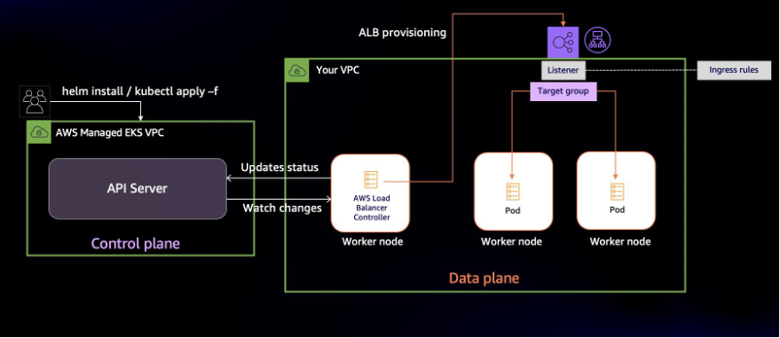 AWS에서는 AWS 로드밸런서 컨트롤러를 통해 ALB(Application Load Balancer)를 프로비저닝하고,