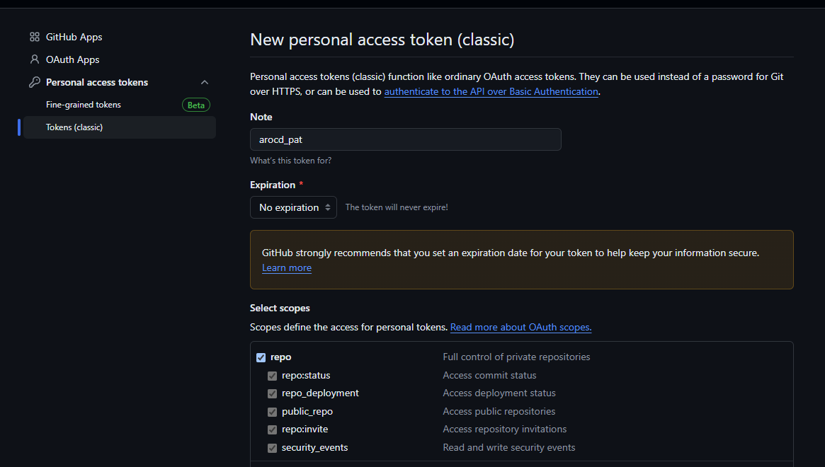 우선 ArgoCD Repository의 변경사항을 모니터링할 수 있게 Personal Access Token을 발급해줘야한다.