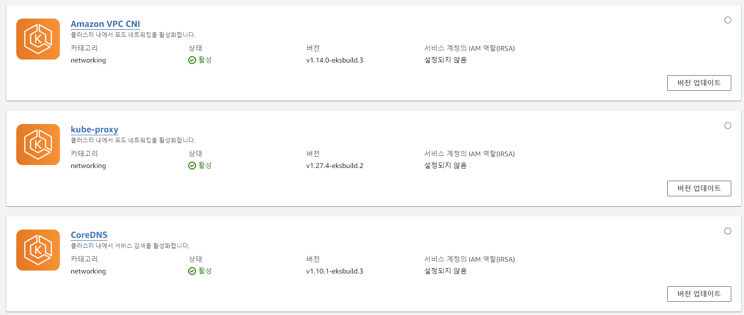 현재 서비스에서 사용 하고 있는 추가기능은 Amazon VPC CNI, kube-proxy, CoreDNS, Amazon EBS CSI 드라이버이다.