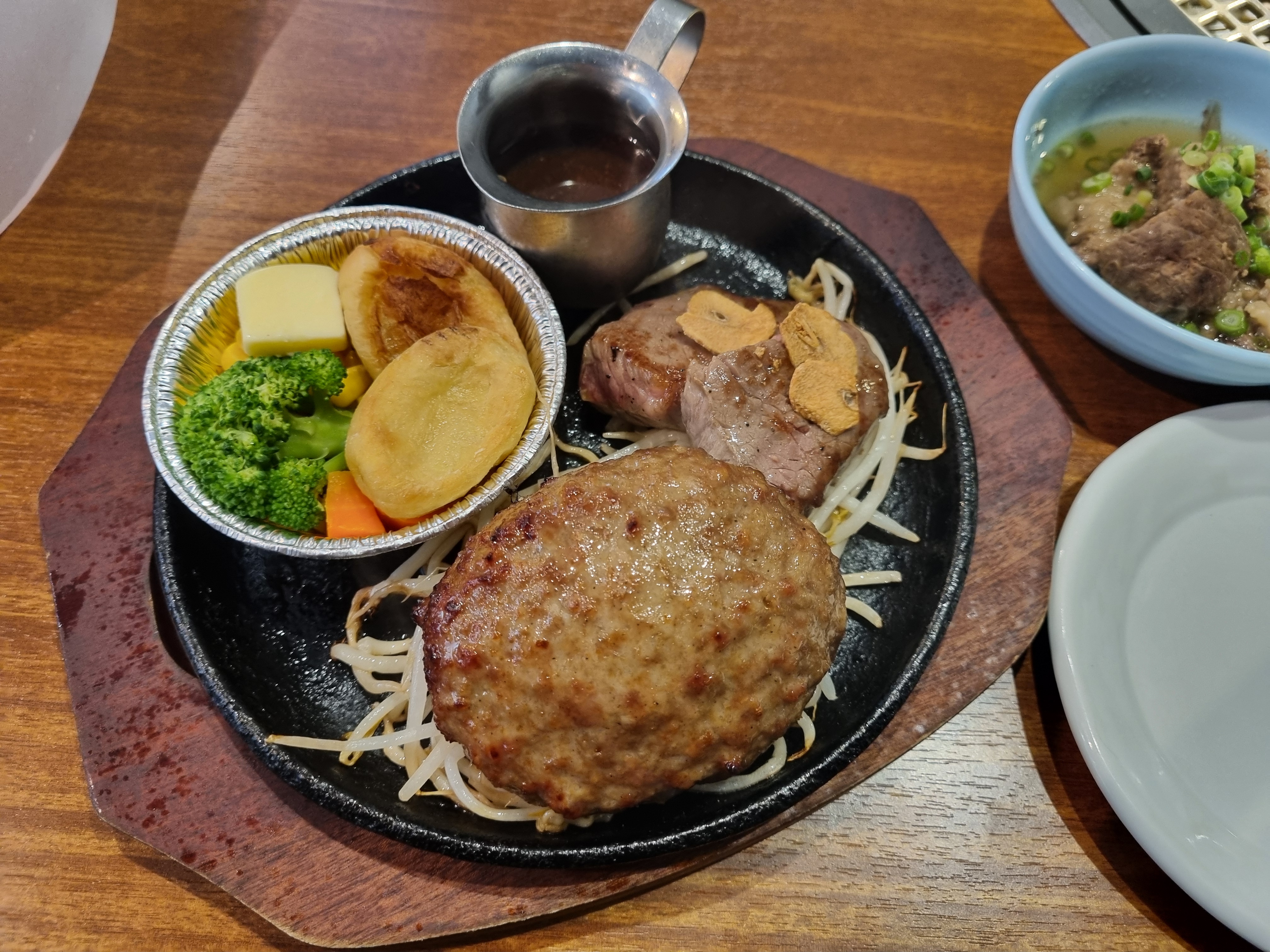 두번의 일본 여행에서의 경험 상 구글 평점은 거짓말을 하지 않는다. 리뷰를 보다보니 런치세트로 햄버그 세트를 추천하길래, 햄버그 세트에 스테이크를 사이드로 주문했다. 갈비찜 같은 걸 기본 음식으로 주셨는데, 이것도 맛있었다. 햄버그는 처음 딱 찢었을 때 육즙이 장난 아니었다. 다만, 내부가 살짝 덜익어있으니 불판에 조금 더 익혀 먹으면 좋다. 다 먹은 후 디저트를 따로 주셨는데(메뉴 판에 있었는데 내가 못 봤음) 초코 아이스크림과 아이스 커피를 선택했다. 디저트로 함께 나오는 두부 푸딩이 달달한게 정말 맛있었다.