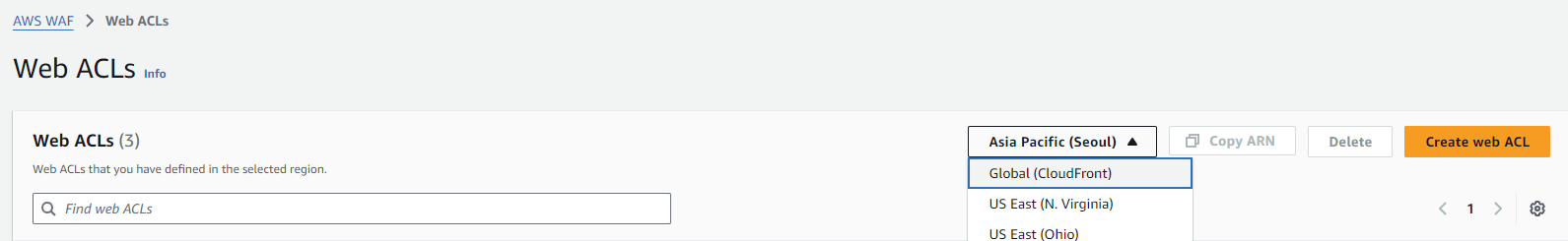 가장 먼저 의심을 했던 WAF의 Web ACLs의 리전 설정을 보면 첫 탭에 CloudFront가 있다.