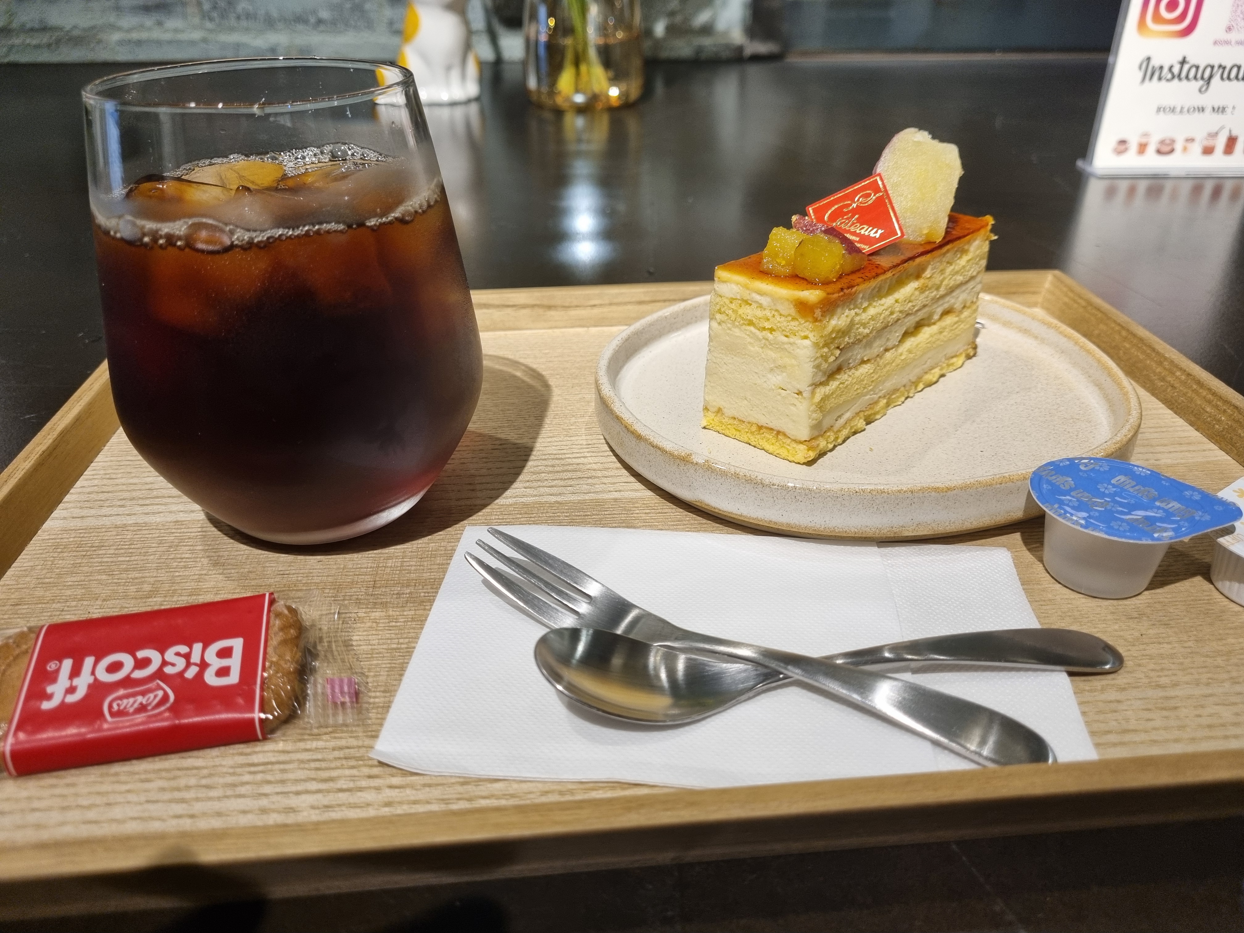캐널시티 바깥쪽으로 나오면 바로 보이는 소라 카페라는 카페로 갔다. 매장은 작았지만 입구서부터 분위기가 있었다. 맑은 날에 왔으면 더 좋았을 것 같았다.아이스커피와 디저트를 주문했는데, 디저트가 정말 맛있었다. 여기선 아메리카노 같은 커피를 그냥 아이스커피라 하는 것 같았다.