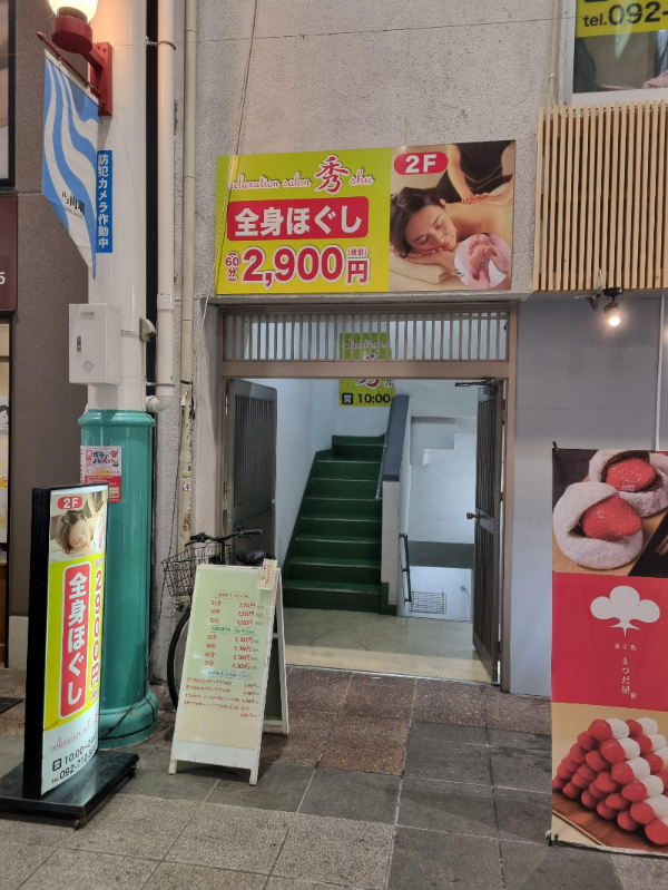 많이 걸었던 만큼 허리랑 다리가 아팠다. 그래서 낮에 카와바타 상점가를 둘러볼 때, 마사지 가게가 많이 보여서 마사지를 받아볼까 고민을 했었다. 그런데, 마사지 가게가 뭔가 허름해서 위험해보였었다. 구글링을 해보니 별 문제가 없는 것 같아서 숙소랑 가까운 곳에 있는 마사지 가게에 들어갔다.