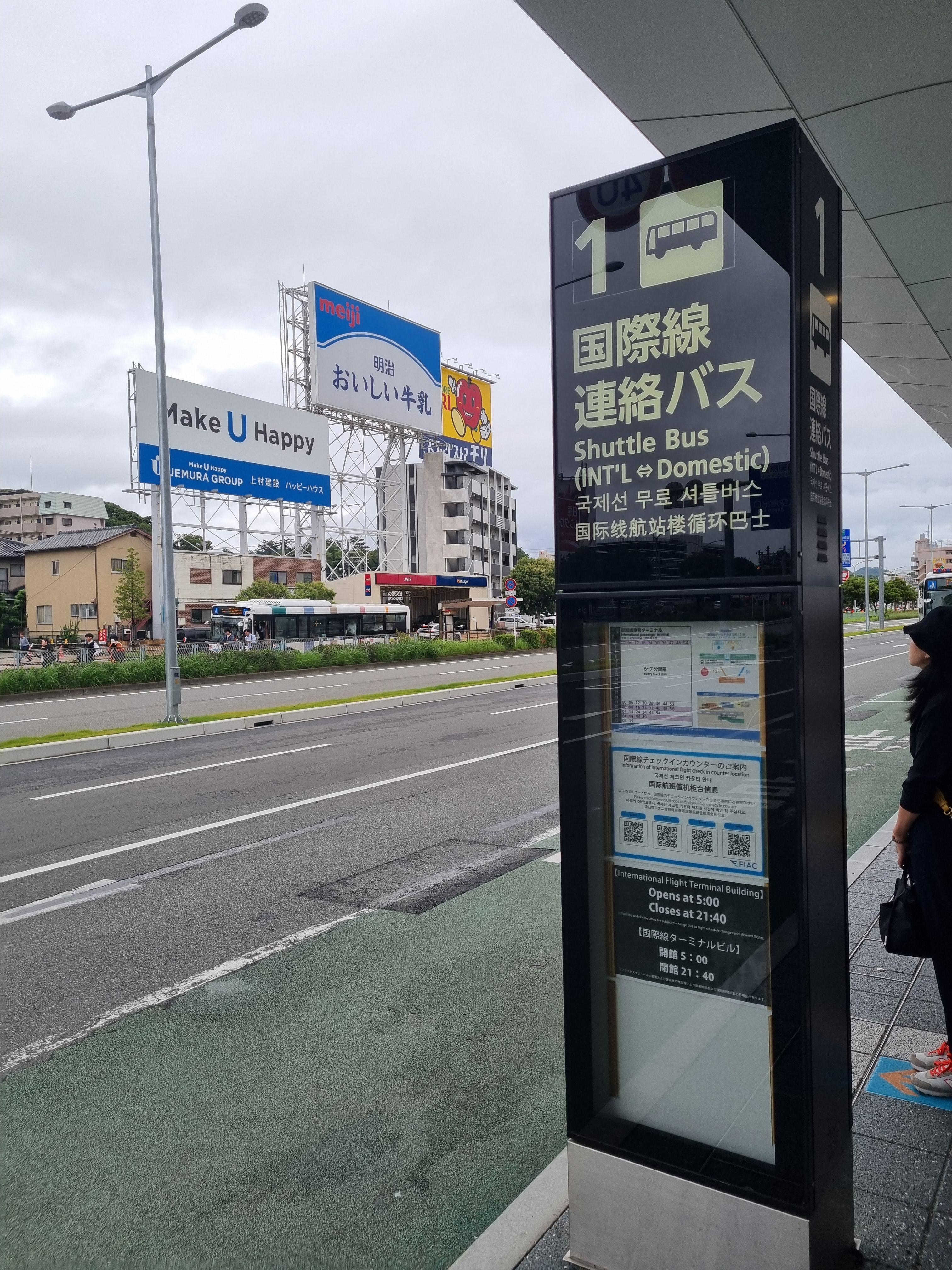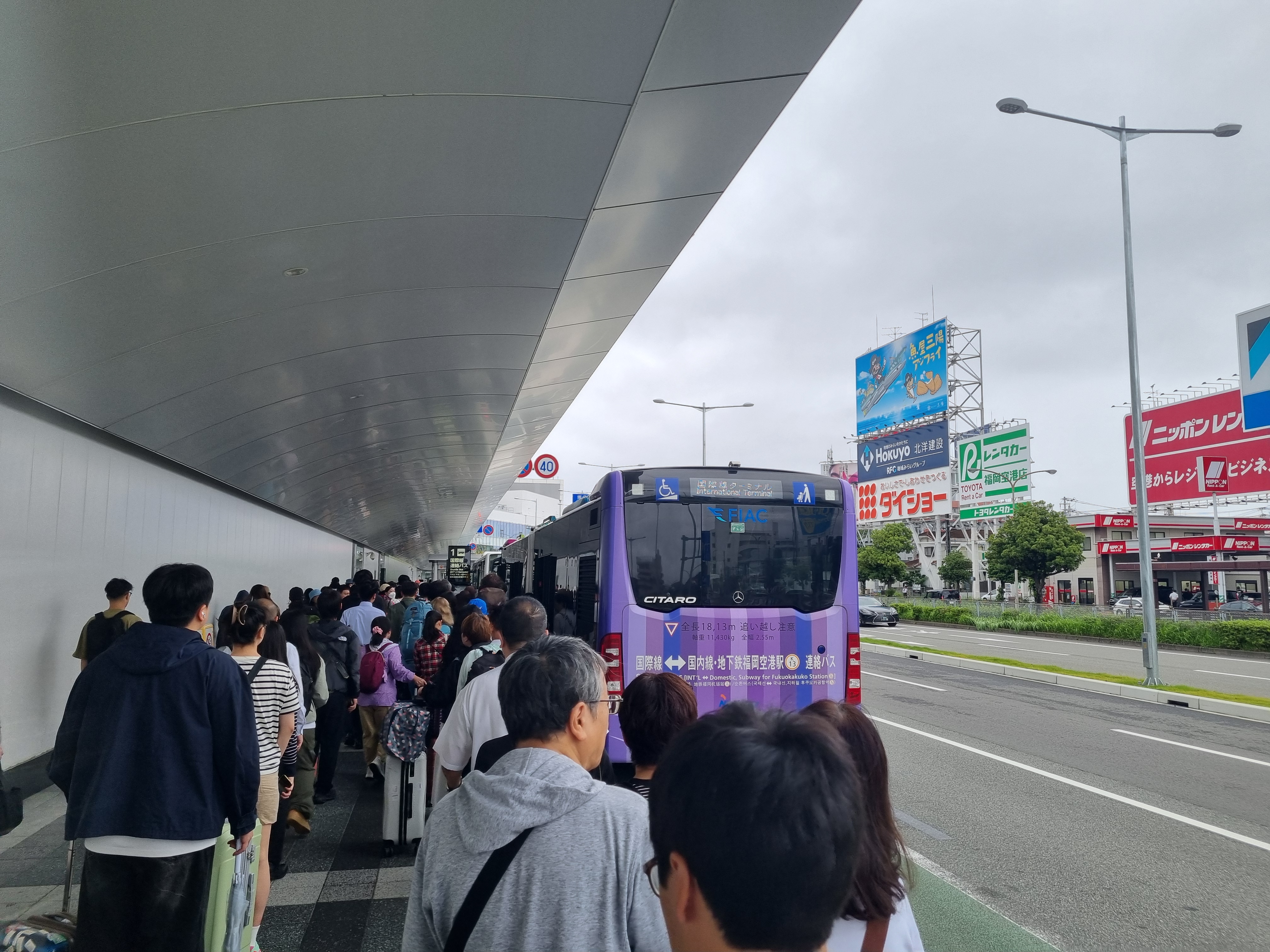 공항선을 타고 후쿠오카 공항으로 가면 국내선으로 가는데 국내선에서 내리면 국제선 셔틀버스를 타는 곳으로 안내가 잘 되어있다. 밖으로 나와보면 사람이 이른 아침 시간인데도 사람이 엄청 많았다. 그래도 10분주기로 버스가 온다고 하고, 버스가 엄청 커서 별 문제는 없어보였다.