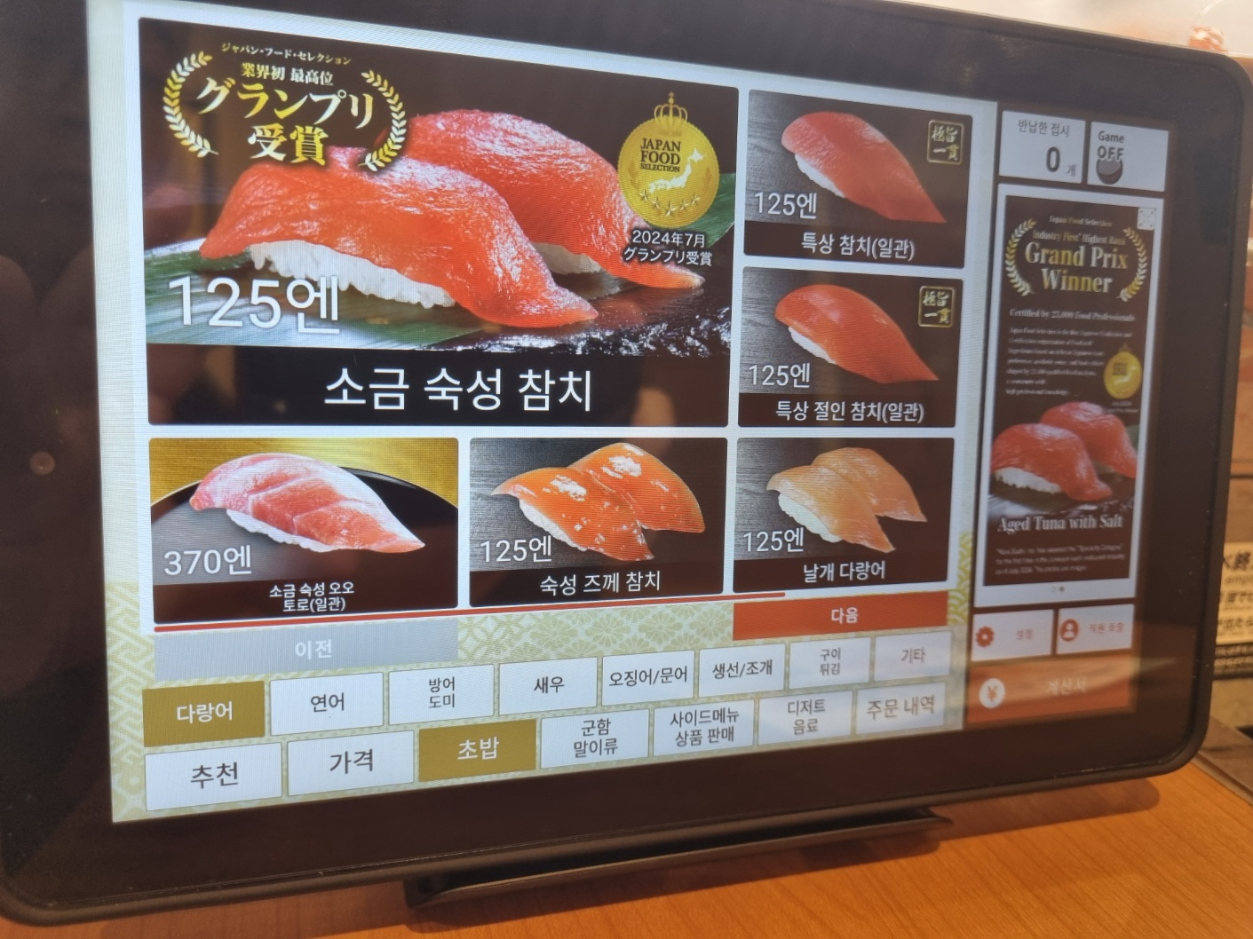 두번째는 키오스크를 통해 초밥을 직접 주문하는 것이다. 위 레일이 주문한 음식이 도착하는 곳이다. 가격은 다양하다.
