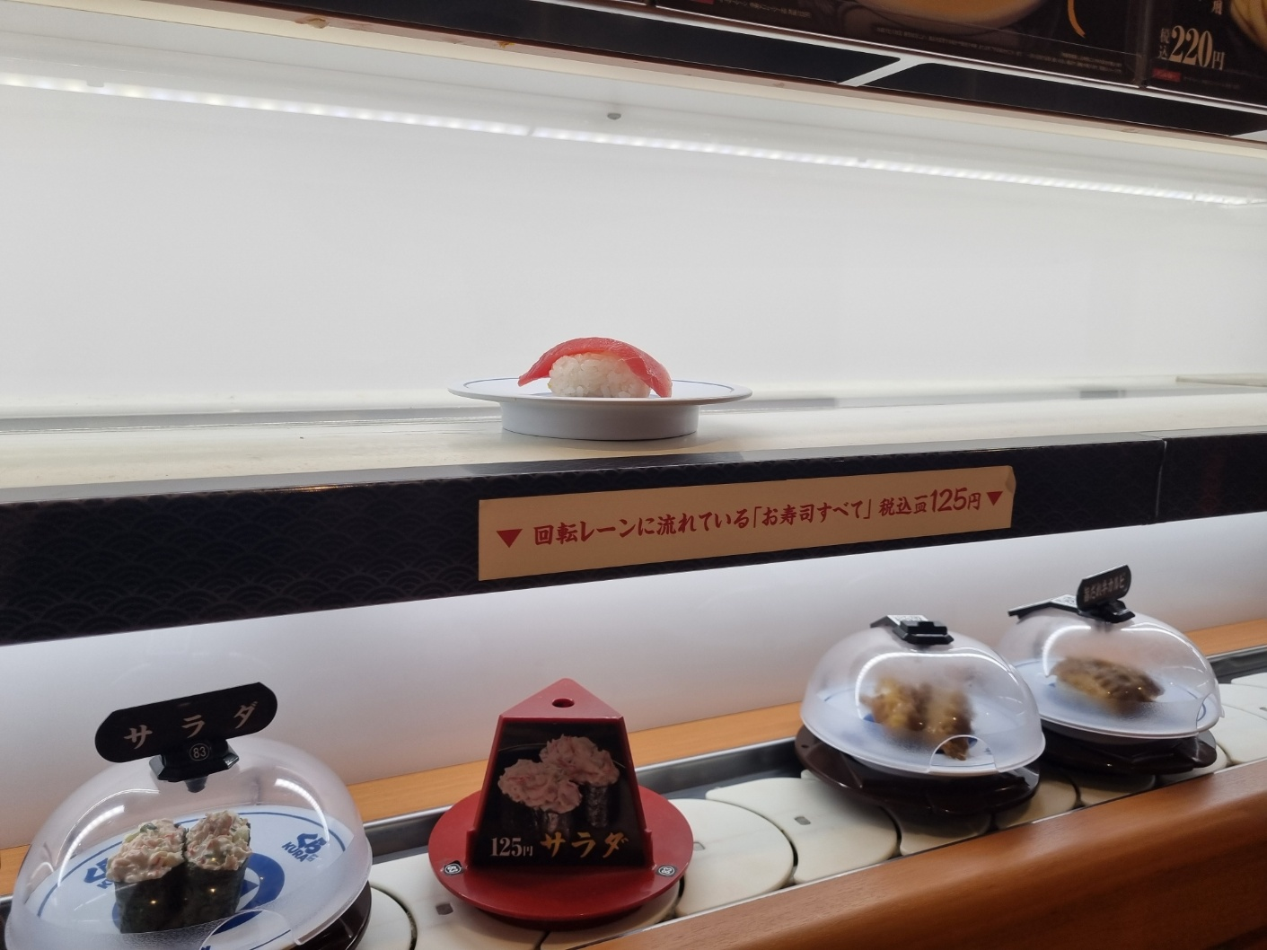 쿠라스시는 우리나라 회전초밥과는 주문하고 음식을 받는 방식이 많이 다르다. 일단 번호표에 적힌 자리로 가면 두 개의 레일이 있다. 아래 레일에는 다양한 초밥이 레일을 돌고 있고, 위 레일은 아무것도 없는 것을 볼 수 있다.