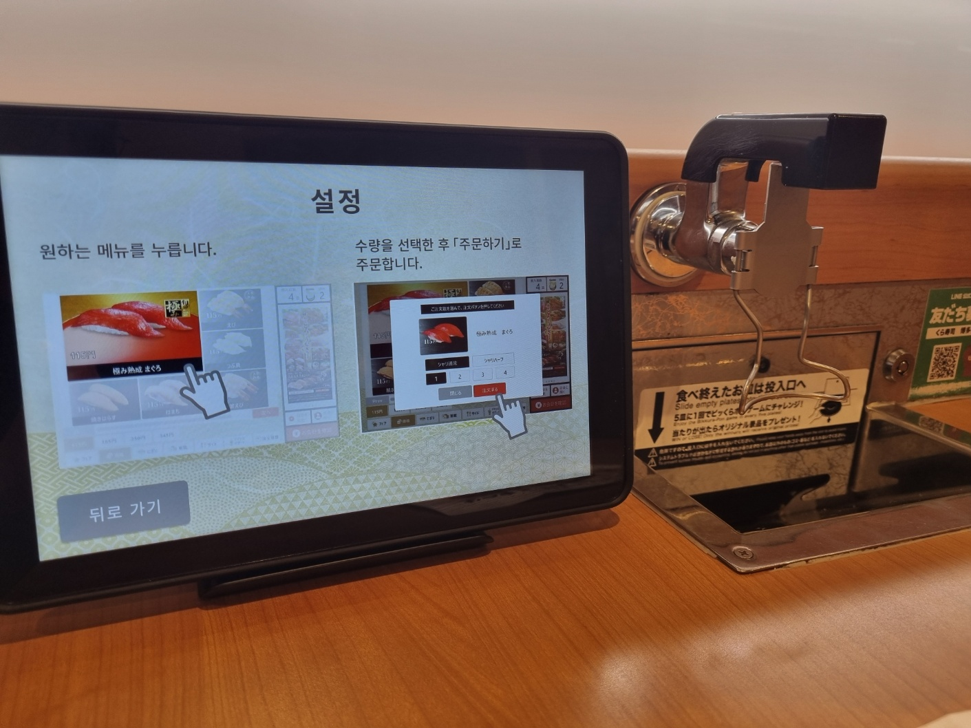 사진에 담지는 못했지만, 성게알 후토마키와 간장 새우까지 먹었다. 계산은 키오스크에서 할 수 있는데 계산하기를 하면 점원이와서 접시를 잘 치웠나 확인하고 계산대까지 안내해준다.